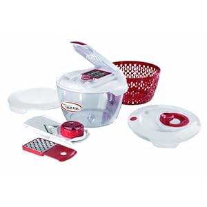 Salatschleuder mit umfangreicher, Ausstattung zum Hobeln, Raspeln, Schneiden u.v.m